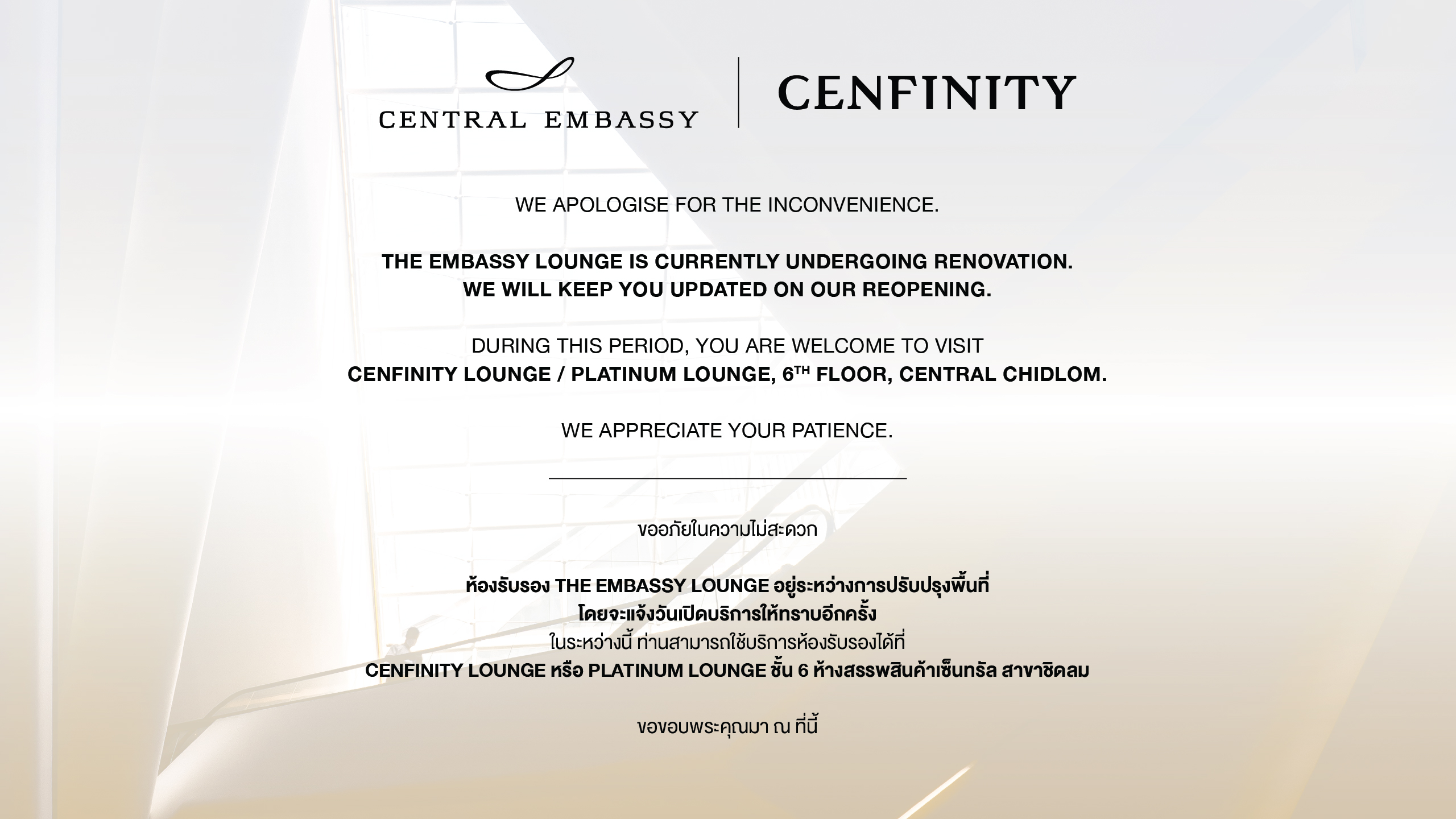 Central Embassy would like to inform our valued customers that The Embassy Lounge on Level 4 is currently undergoing renovations. We will keep you updated on its reopening. During this period, you are welcome to visit the CENFINITY Lounge on the 6th Floor of Central Chidlom.